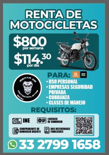 En Renta de Motocicletas GN ofrecemos motocicletas confiables y listas para trabajar, ideales para repartidores de aplicaciones, empresas y uso personal. Contamos con planes flexibles y precios accesibles que se adaptan a tus necesidades.